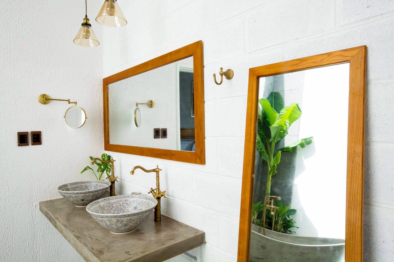 Những chiếc gương khung gỗ hoặc có khung bằng đồng thau khi lắp đặt sẽ tạo điểm nhấn nổi bật và mang đến sự đồng điệu về phong cách kiến trúc cho cảnh quan nội thất phòng tắm. Vẻ đẹp mỹ thuật mộc mạc, phong cách “handmade” của chúng giúp lược bỏ tính công nghiệp máy móc, dễ gây nhàm chán như những chiếc gương khung inox hiện đại, sáng bóng.