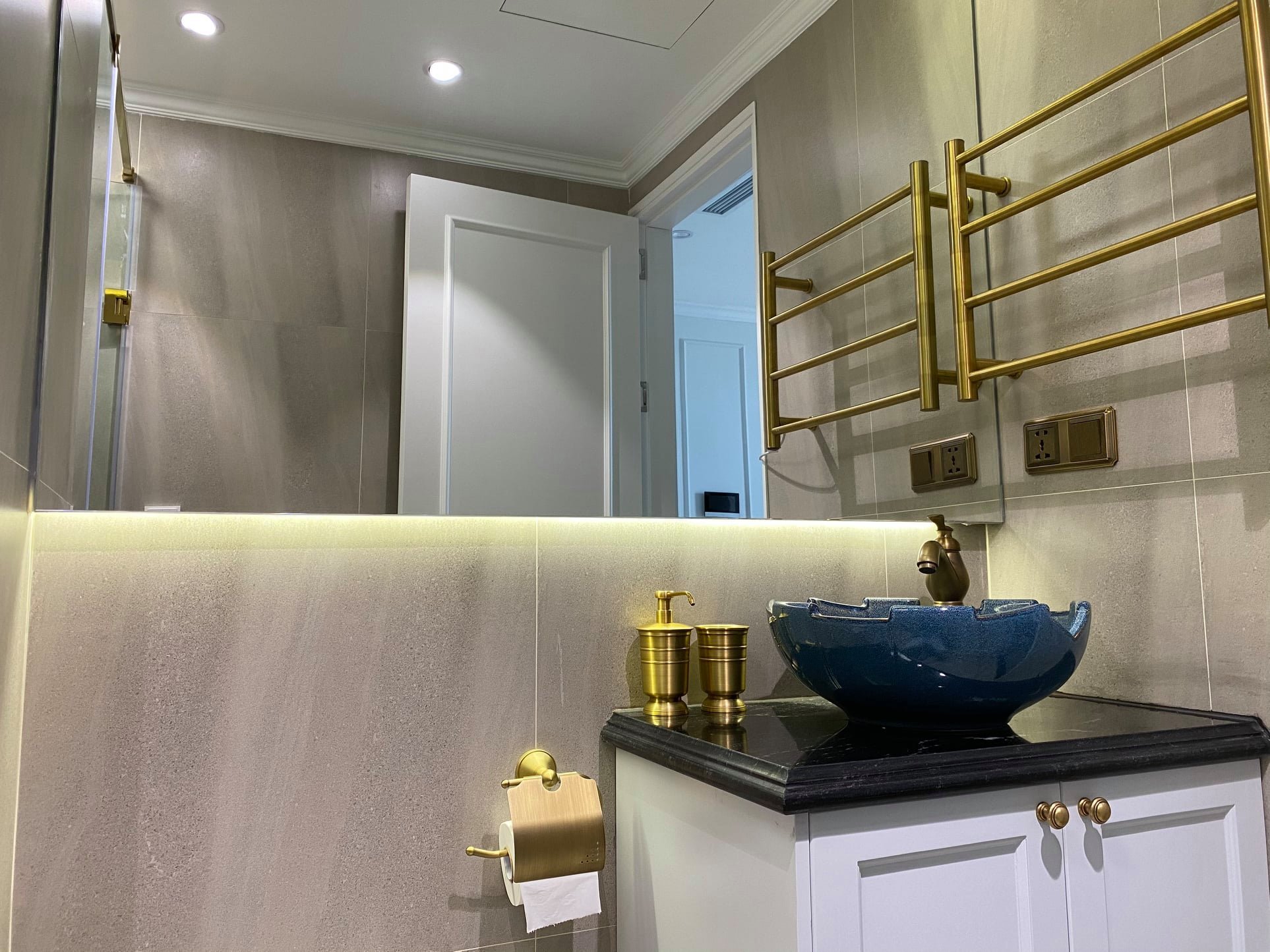 Một chiếc gương lớn vừa giúp ăn gian diện tích, vừa tô điểm cho không gian nhà tắm của gia đình bạn