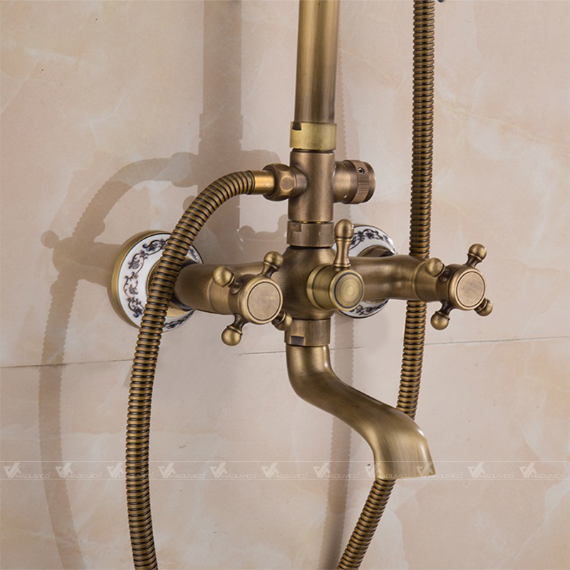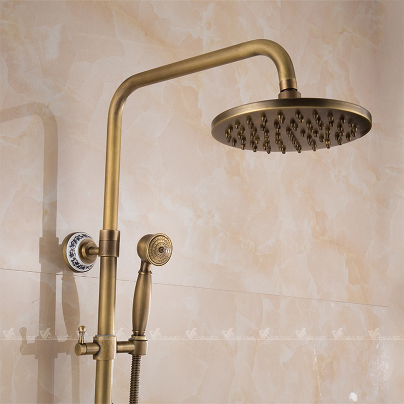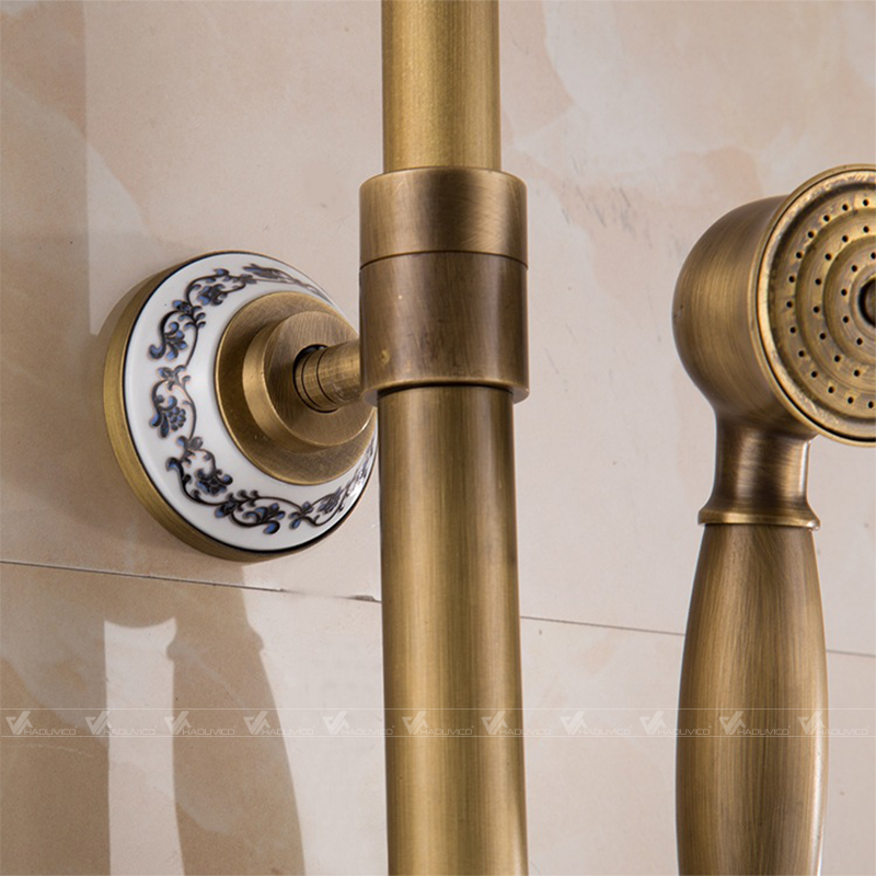 Bộ sen cây tắm đứng bằng đồng thau kiểu ST041 đầy đủ các chức năng, tay vòi và đế có bọc sứ hoa văn nghệ thuật, phù hợp với không gian nội thất kiểu cổ sang trọng.