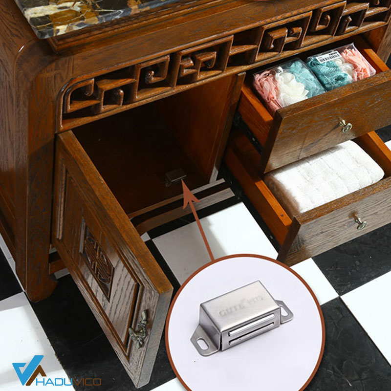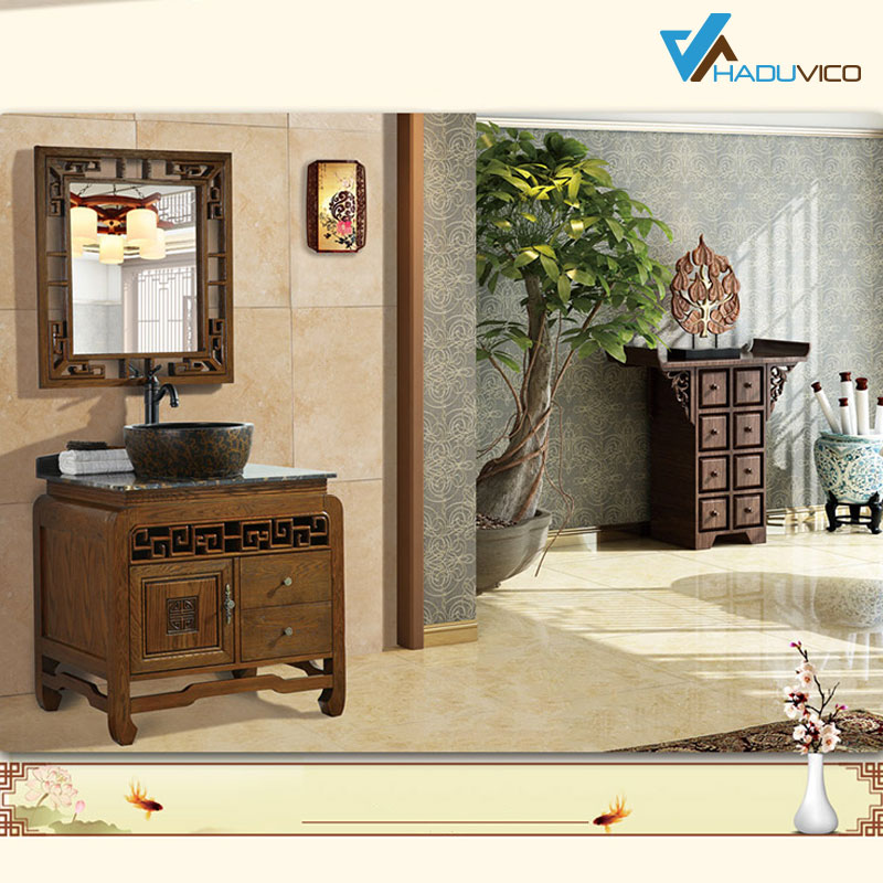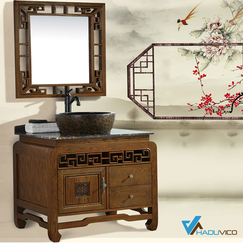 Mặt bàn đá mỹ thuật có thể gia công lỗ thoát để lắp đặt loại lavabo nổi rất phù hợp. Kết hợp cùng loại vòi bằng đồng thau đúc với tông màu đen sẽ tạo điểm nhấn cho toàn thể không gian. Tủ có 2 ngăn chính và 2 ngăn kéo phụ tuy thể tích không lớn những vẫn có thể cất chứa được rất nhiều đồ cần thiết cho nhà tắm.