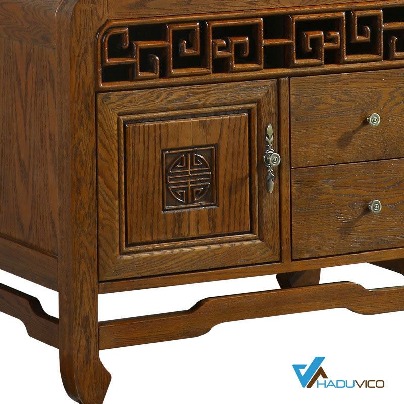 Bàn trệt với thiết kế mang không nhiều đường cong, uốn lượn vô mà chủ yếu là các đường vuông góc trên bề mặt khiến sản phẩm mang theo nét cổ lão nhưng mộc mạc và giản dị. Nắm tay cầm bằng đơn giản, nhỏ gọn giúp tiết kiệm nhiều chi tiết không cần thiết cho không gian xung quanh. Diện tích bề mặt của bàn thuộc loại vừa phải, không quá lớn nên cần lựa chọn loại lavabo kích thước phù hợp.